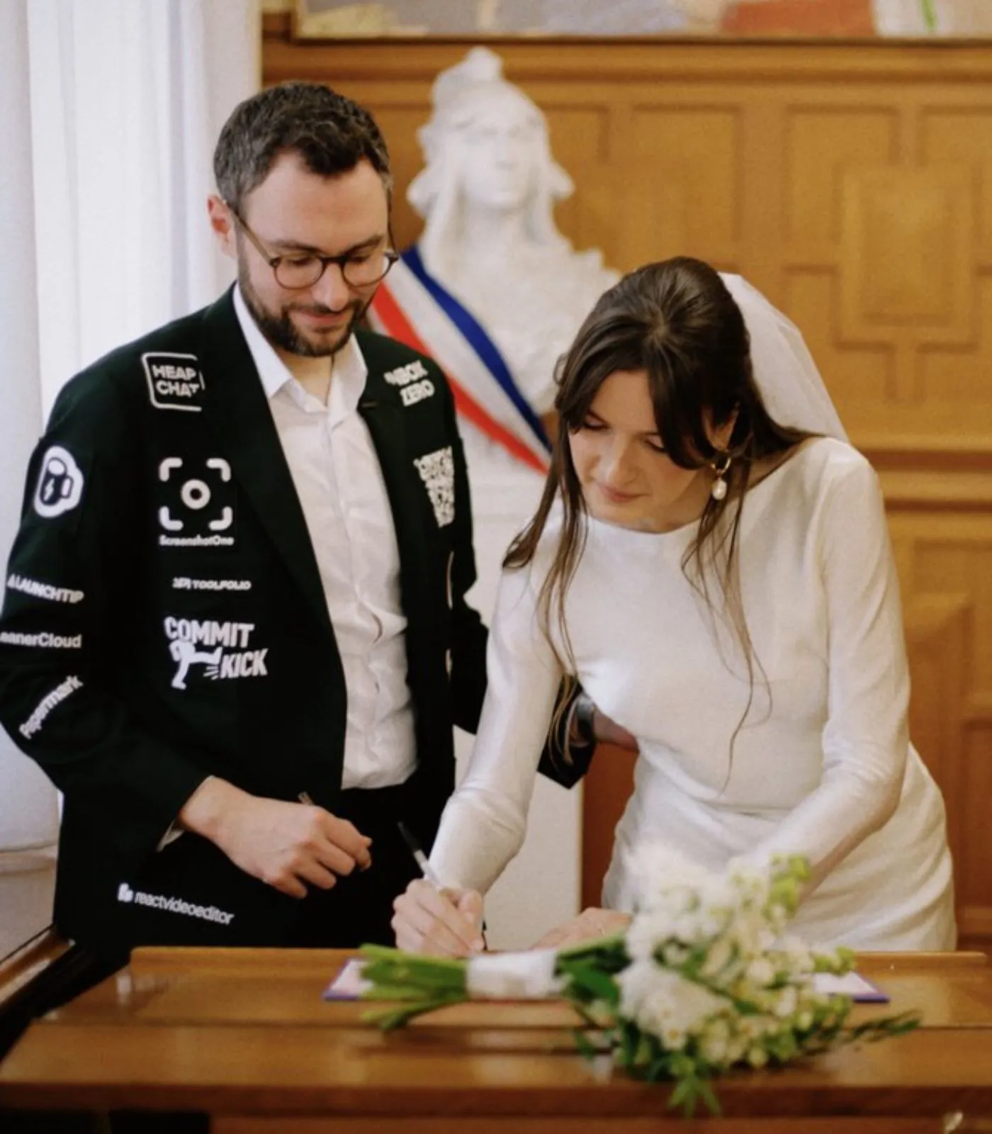 ප්රංශ ව්යවසායකයෙක් තම මංගල tuxedo එකේ දැන්වීම් ප්රදර්ශනය කර තිබෙන ඡායාරූප සමාජ මාධ්ය වල ප්රසිද්ධ වුණා.