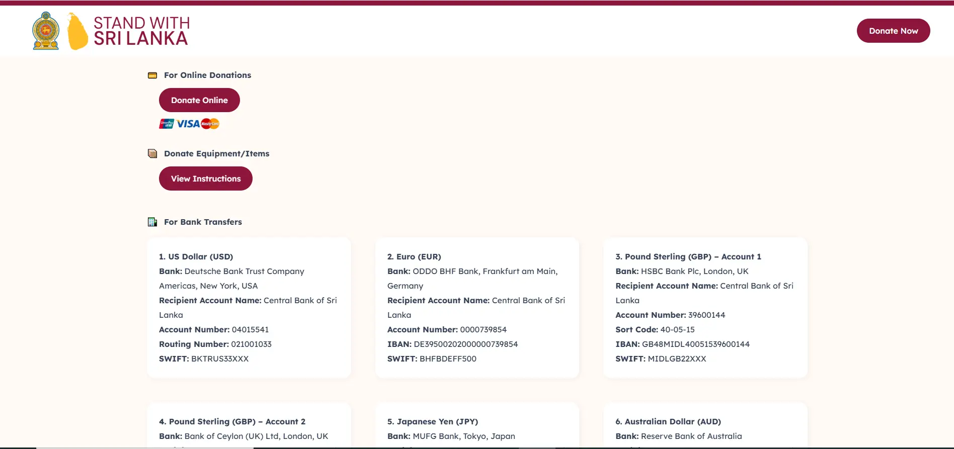 බලපෑමට ලක් වූ පවුල්වලට සහාය වීම සඳහා ඔබගේ දායකත්වය ලබා දිය හැකි වෙබ් අඩවියක් ‘Stand With Sri Lanka‘ නමින් රජය විසින් හඳුන්වා දී තිබෙනවා.