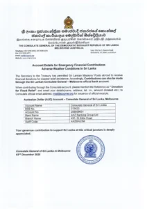 ආපදා සහන ආධාර සඳහා මූල්ය පරිත්යාග ලබා ගැනීමට භාණ්ඩාගාර ලේකම්වරයා විදේශයන්හි ශ්රී ලංකා දූත මණ්ඩල/තනතුරු වලට අවසර දී තිබෙනවා. ඒ අනුව තමයි ඔබේ ආධාර Melbourne වල ශ්රී ලංකා කොන්සල් ජනරාල් කාර්යාලයේ නිල බැංකු ගිණුම හරහා යොමු කළ හැකි වන්නේ.